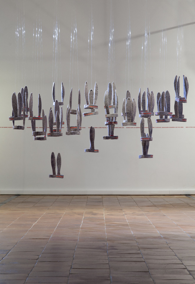 Uma folha de papel branco à minha frente é um corpo com o qual eu me deparo, me meço. Tenho a capacidade de me inscrever, de sair fora, de me expressar. Mas é sempre um corpo que se mede com o meu corpo. Seja num desenho pequeno, grande, seja numa escultura, seja na montagem de uma exposição. São sempre as medidas do corpo e as maneiras como elas vão ampliando, crescendo, encolhendo, mudando de local. Ir de um lado ao outro, de cima a baixo, percorrer, parar, avançar, fazer um zoom, ter um olhar de baixo para cima, medir de cima para baixo, são os assuntos do meu trabalho.