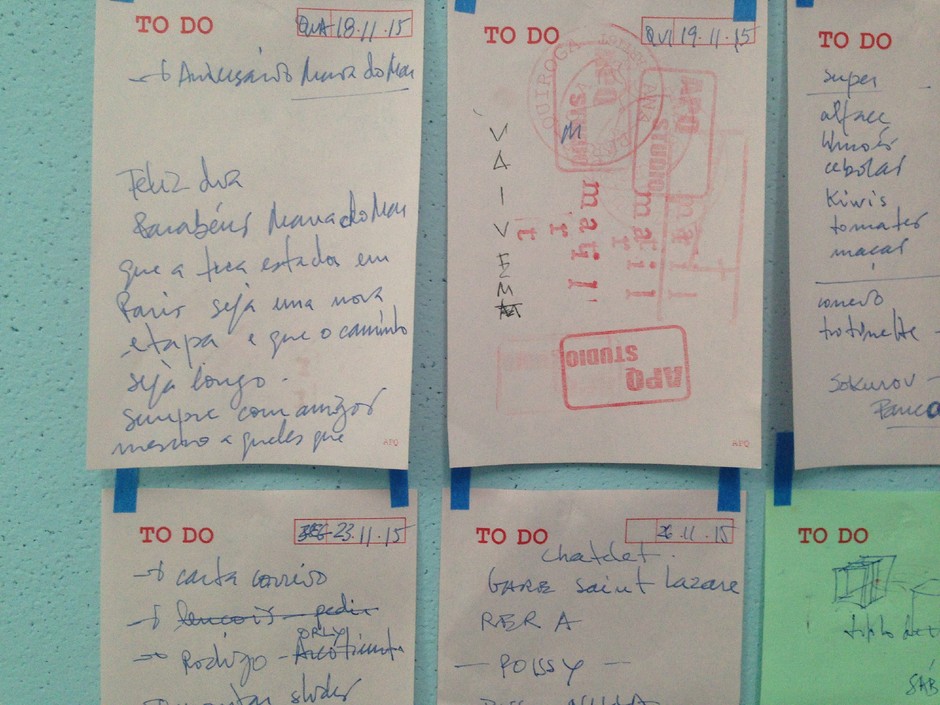 Também. Há pessoas que lêem vários livros em simultâneo: eu tenho vários blocos. Cada bloco tem registos que podem ter cinco ou sete anos de diferença. Desenho num, depois noutro. Além de desenhar em casa, também os levo para viagens. Pego sempre no que está à mão, vou variando. Desenho basicamente aquilo que se vê em exposições, mas também escrevo pequenos apontamentos. Posso tomar nota de um número de telefone ou de uma morada, ou de uma coisa que tenho de fazer e que não posso esquecer, ou uma ideia que tive.